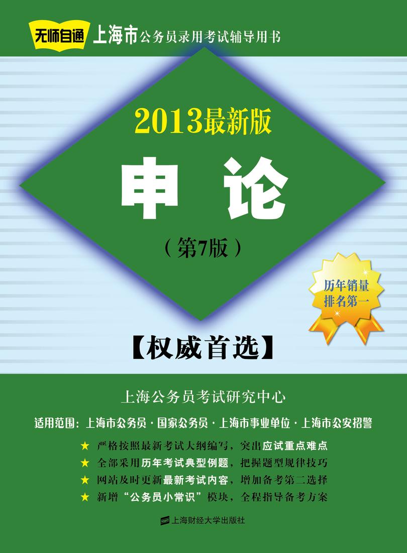 上海公务员考试研究中心出版的《申论(2013最新版第7版)》依照最新考纲编写,注重上海市公务员录用考试的特点,及时增补了最新考纲相较于旧考纲的新知识点。采用了最新年度的上海市公务员录用考试的历年试题和国家考试的典型考题,并做了详细、透彻的解析,同时也对一般题目进行了解析,帮助考生掌握题型规律和解题方法。公布了最